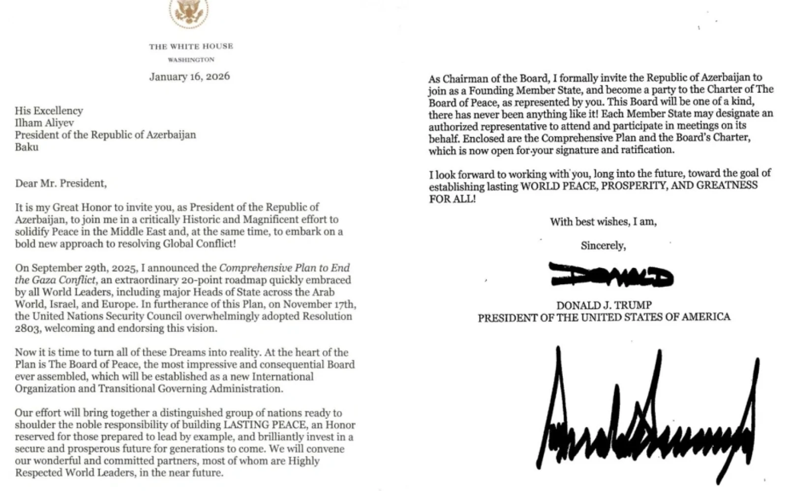 Şuranın Sədri kimi, Azərbaycan Respublikasını təsisçi üzv dövlət qismində qoşulmağa və Sizin təmsilçiliyinizlə Sülh Şurasının Nizamnaməsinə tərəf olmağa rəsmi şəkildə dəvət edirəm. Bu Şura bənzərsiz bir qurum olacaq – indiyədək buna oxşar heç bir qurum mövcud olmayıb! Hər bir üzv dövlət onun adından iclaslarda iştirak etmək və təmsil olunmaq üçün səlahiyyətli nümayəndə təyin edə bilər. Əlavədə əhatəli plan və hazırda imzalanma və ratifikasiya üçün açıq olan Şuranın Nizamnaməsi təqdim olunur.