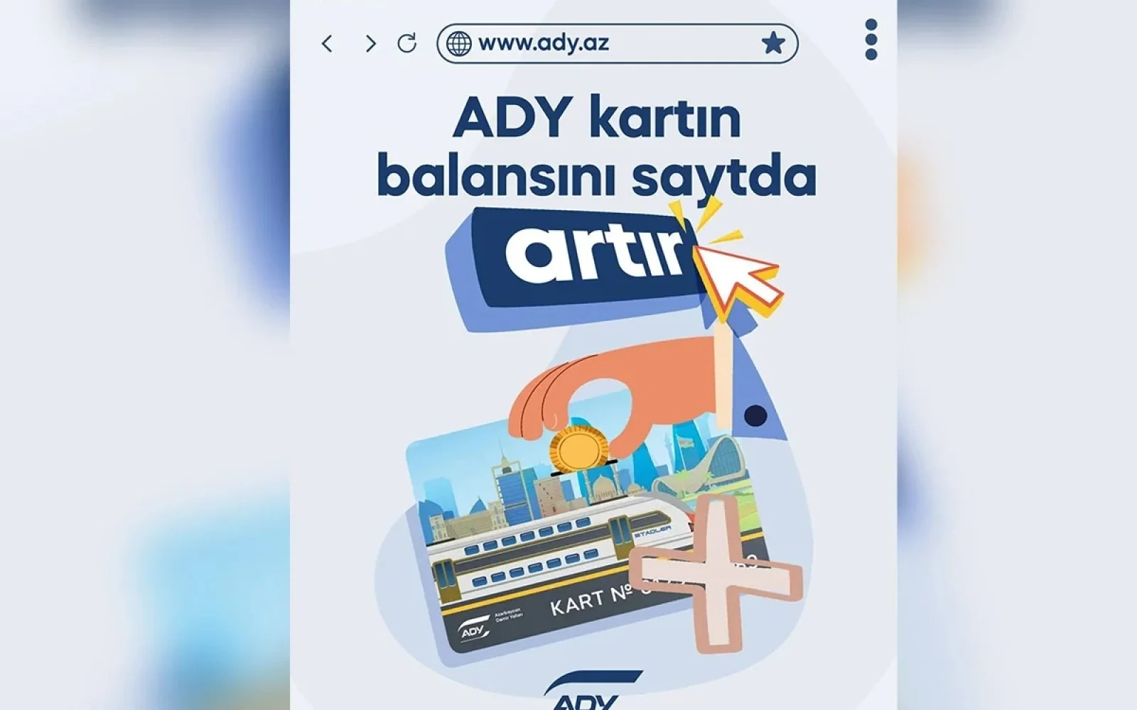 “Azərbaycan Dəmir Yolları” QSC-nin fiziki gediş kartlarının balansına www.ady.az saytı vasitəsilə də vəsait yükləmək mümkündür.