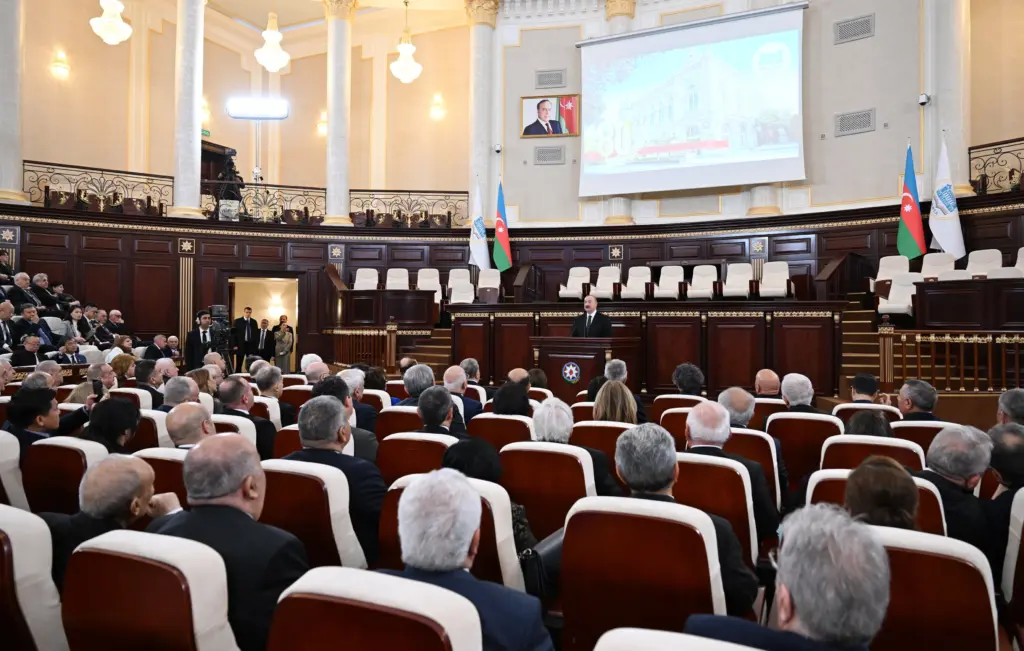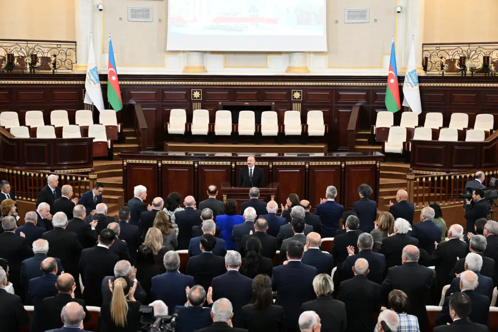 Mən 10 il bundan əvvəl – Akademiyanın 70 illiyində bax bu salonda alimlər qarşısında çıxış etmişdim və çalışırdım ki, bu 10 il ərzində ölkə qarşısında duran bütün başqa vəzifələrlə yanaşı, elmin inkişafına da öz dəstəyimi göstərim. Bu gün bəzi fikirlərimi sizinlə bölüşmək istəyirəm. Çünki son 10 il ərzində həm dünyada, həm Azərbaycanda köklü dəyişikliklər baş vermişdir. Dünya iqtisadiyyatı tamamilə dəyişmiş, dünyada gedən siyasi proseslər, müharibələr, hərbi toqquşmalar, beynəlxalq hüququn pozulması, mövcud olan qaydaların tamamilə aradan qaldırılması göz önündədir. Azərbaycana gəldikdə, son 10 il bizim üçün inkişaf və zəfərlərlə zəngin illər olmuşdur. Əsas vəzifə – torpaqlarımızın azad edilməsi, ərazi bütövlüyümüzün bərpası, suverenliyimizin bərpası layiqincə təmin edilmişdir. Bu gün Azərbaycan bütün suveren torpaqlara sahibdir. Bizim ərazimizdə işğalçı qüvvələr yoxdur. Bizim ərazimizdə xarici hərbi birləşmələr yoxdur. Bu gün biz bu torpaqlarda qurub-yaradırıq. Biz bir neçə gündən sonra şanlı Zəfərimizin beşinci ildönümünü qeyd edəcəyik. Son beş il ərzində dünyada bir çox yerlərdə müharibələr, toqquşmalar, münaqişələr baş verirdi və hər şey müqayisə ilə ölçülür. Bunu da alimlər yaxşı bilir. Deyə bilərəm ki, bizim qədər parlaq, tam və mütləq Qələbə qazanan ikinci ölkə olmamışdır.