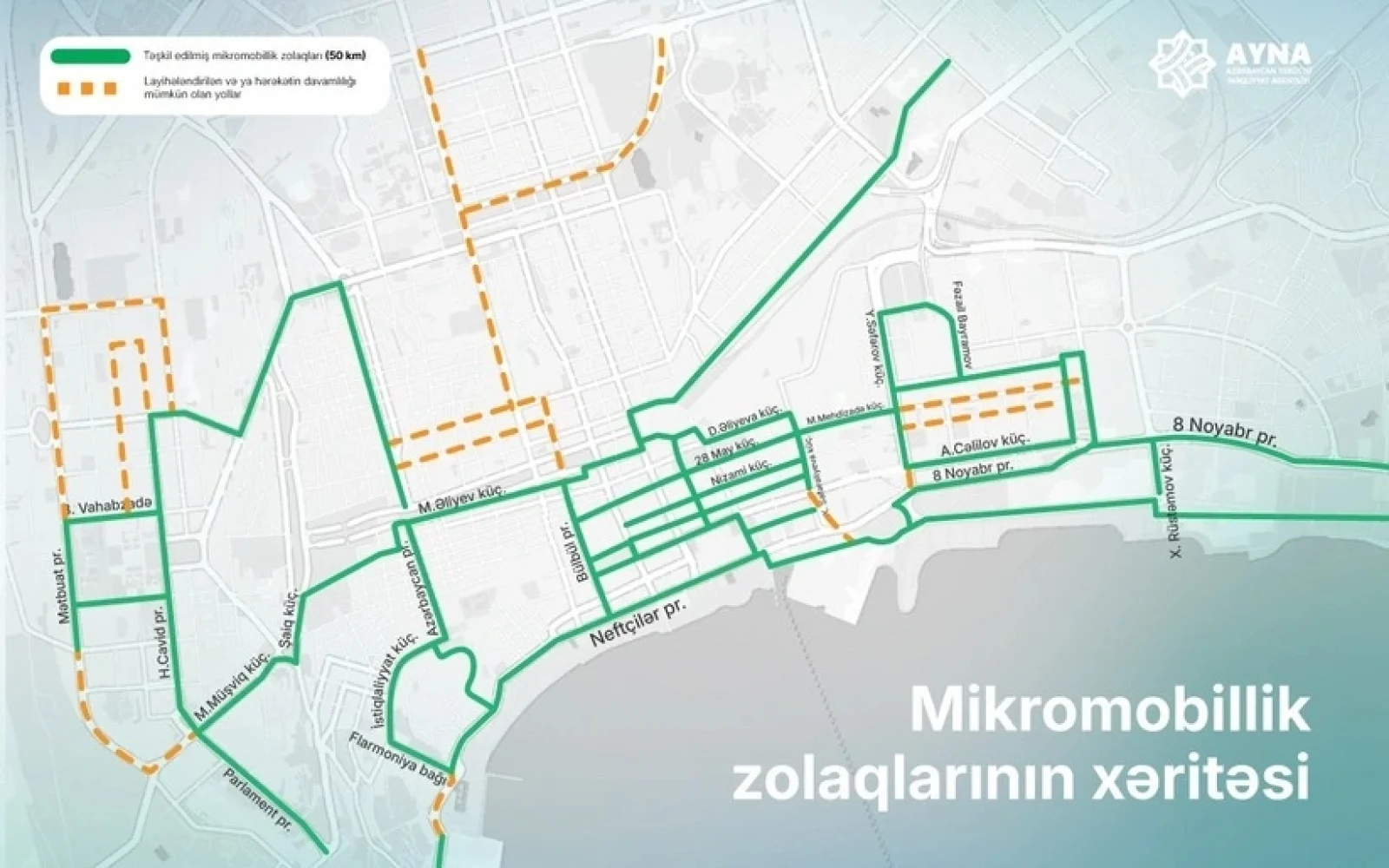 Kəsintisiz mikromobillik zolağının təşkili üçün mərhələli qaydada velosiped yolları əlaqələndirilir. Şəbəkənin davamlılığına nail olmaq və mikromobillik vasitələrindən istifadə edən hərəkət iştirakçılarının təhlükəsizliyini və rahatlığını təmin etmək məqsədilə ötən il mikromobillik zolaqları paytaxtın Hüseyn Cavid, Xətai və İnşaatçılar prospektləri, Bəxtiyar Vahabzadə, Mirzağa Əliyev, Abdulla Şaiq, Məmməd Rahim, Mikayıl Müşfiq, Nəcəfqulu Rəfiyev, İzzət Orucova, Əbdürrəhim bəy Haqverdiyev və Xaqani küçələri, Neftçilər prospektinin kənar yolu (Ağ Şəhər ərazisi), həmçinin Bulvar və Mərkəzi Park ərazilərində yaradılıb. Son olaraq işlər Şıxəli Qurbanov və Cəfər Cabbarlı küçələrində həyata keçirilib.