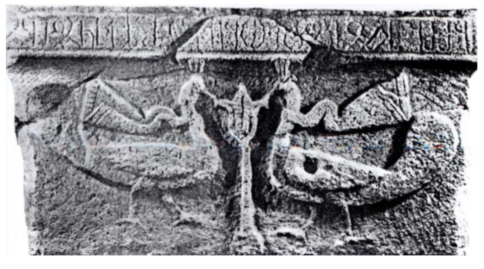 “Qabartma səpkisində yonulmuş bu abidənin yan üz tərəfində dik uzanan bir bitki ətrafında simmetrik səpgidə qurulmuş iki tovuzquşu fiquru təsvir olunmuşdur. Tovuzquşlarının hər ikisinin boyunlarından elə bil havada yellənən uzun baftalar asılmışdır. Alimlərin fikrincə ilk orta əsrlərdə bu baftalar simvolik məna kəsb edərək onu daşıyan quş və ya heyvanın müqəddəs olduğunu bildirirdi.