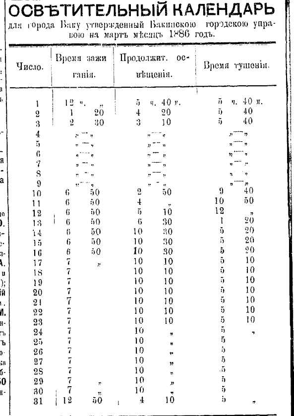 Bununla belə, işıqlandırma fasiləsiz fəaliyyət göstərmirdi. Hər ay şəhər upravası tərəfindən təsdiqlənən xüsusi fənər yanma cədvəli tərtib edilirdi. Orada işığın dəqiq yandırılma və söndürülmə saatları göstərilirdi. Aydın, ay işıqlı gecələrdə kerosin fənərləri yandırılmaya bilərdi, lakin hava buludlu və ya yağışlı olduqda, ayın fazasından asılı olmayaraq onların yandırılması tapşırılırdı. Praktikada isə göstərişlər qeyri-müntəzəm yerinə yetirilirdi və küçələr tez-tez qaranlığa qərq olurdu.
