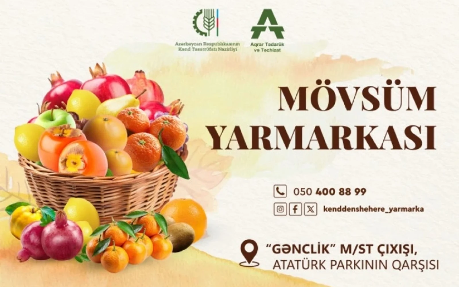 Paytaxtda sabahdan etibarən Kənd Təsərrüfatı Nazirliyinin tabeliyindəki “Aqrar Tədarük və Təchizat” ASC-nin təşkilatçılığı ilə həftəsonları “Mövsüm yarmarkası” keçiriləcək.
