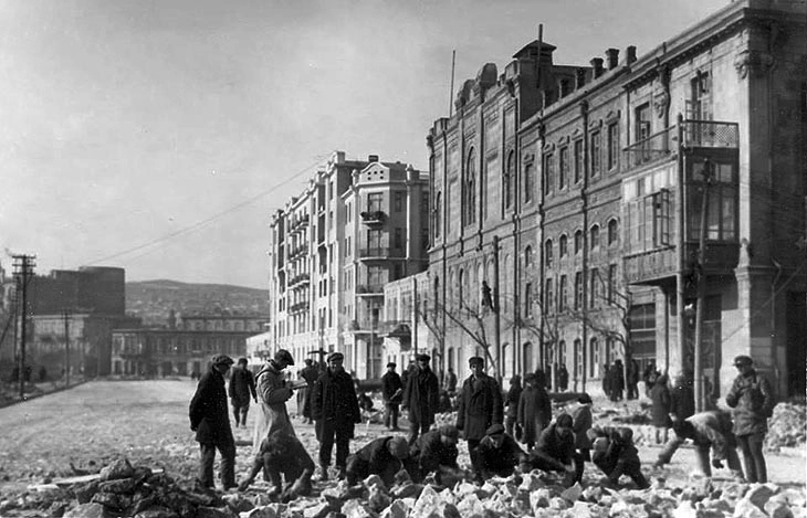 1 fevral 1918-ci ildə teatr atəşə tutuldu: bütün taxta konstruksiyalar yandı, yalnız daş və dəmir-beton karkas qaldı. Teatrın bərpasına dörd ay lazım idi. Lakin bina yalnız sovet dövründə – 1921–1922-ci illərdə bərpa edildi. Həmin vaxta qədər teatrdan yalnız fasadlar qalmışdı. Bu dəfə Teatr binasının bərpa işlərini memar Zivər bəy Əhmədbəyova tapşırılır. Z.Əhmədbəyov teatrı sıfırdan qurur. Lakin Qoslavskinin təklif etdiyi tamaşa zalının əsas sxemini və teatrın fasadlarını olduğu kimi saxladı.