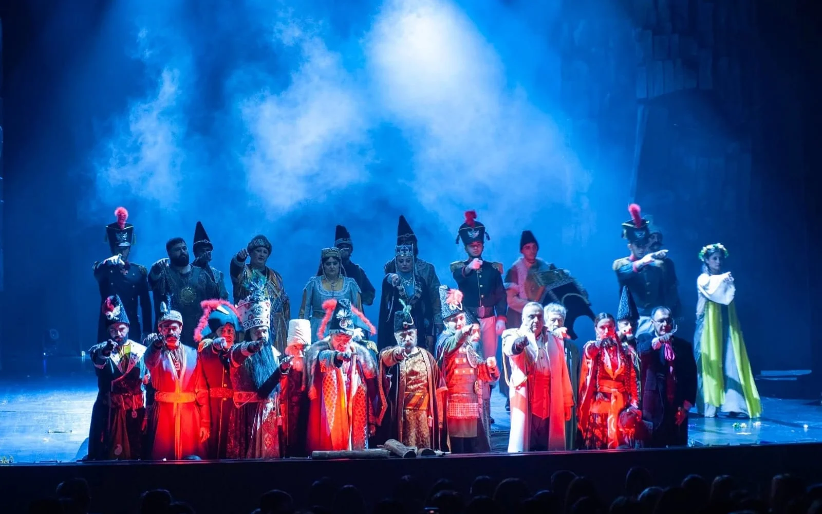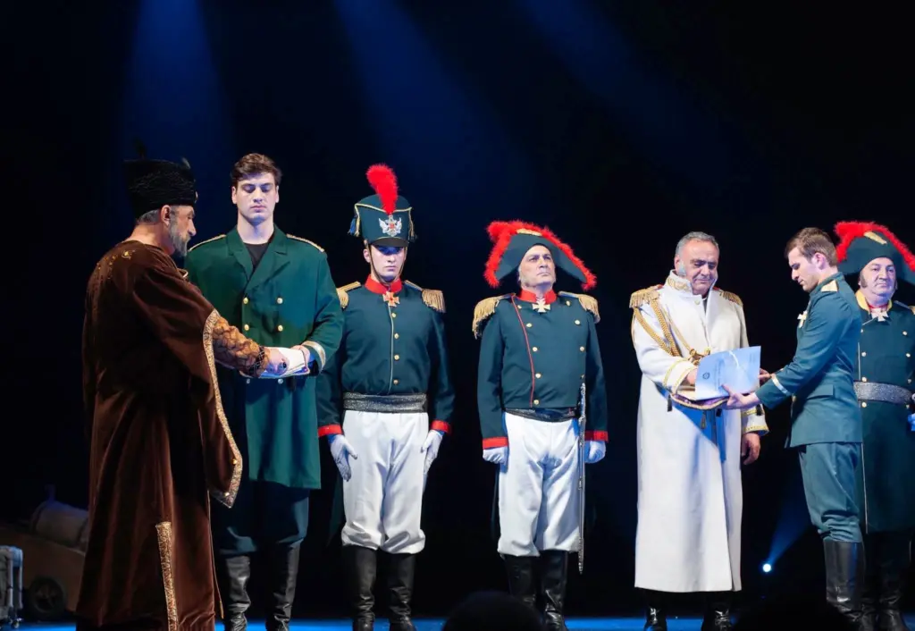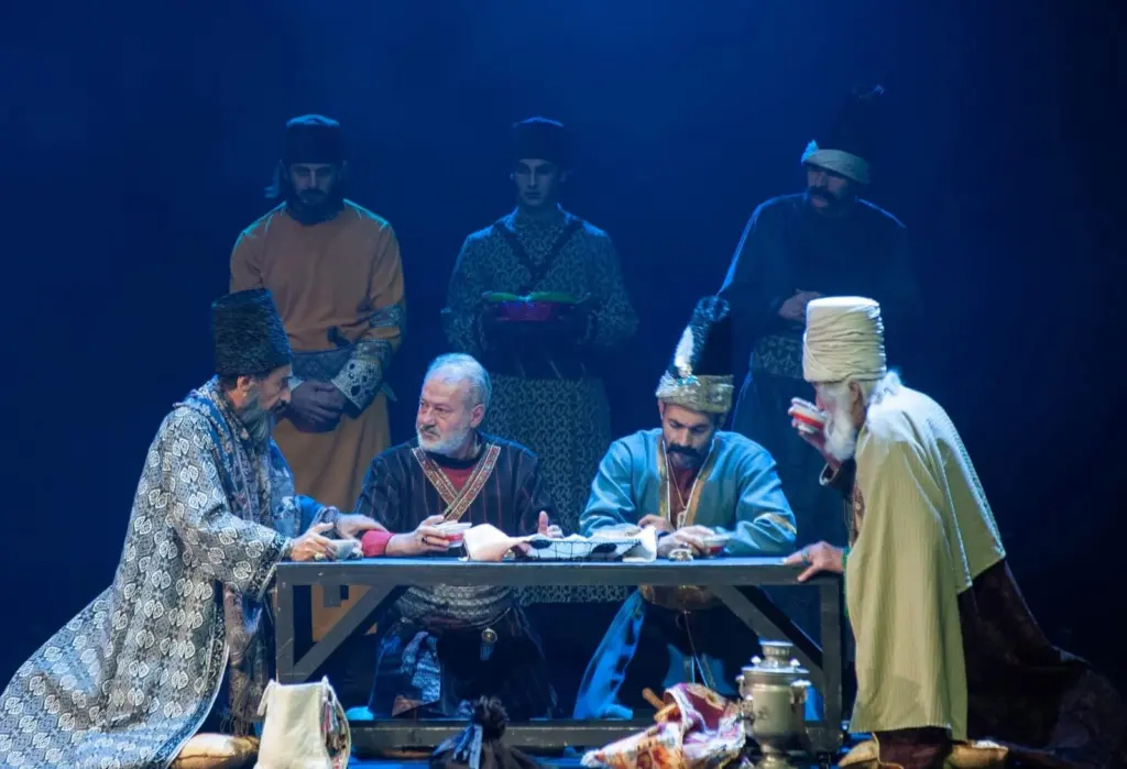 Tamaşada Xalq artistləri Rafiq Əzimov (Molla Müzəffər ağa), Hacı İsmayılov (Münşi Məşədi Həsənağa), Kazım Abdullayev (Hüseynqulu xan), Əməkdar artistlər Füzuli Hüseynov (Knyaz Sisianov), Vəfa Rzayeva (Çariça Mariya), Elnar Qarayev (Mahmud bəy), Anar Heybətov (Dilmanc Şərif bəy), Rövşən Kərimduxt (Fətəli şah), Kazım Həsənquliyev, (Hacı Muxtar), Elşən Rüstəmov (İvan Petroviç Lazarev), Mətləb Abdullayev (Polkovnik fon Qrenfald), Ayşad Məmmədov (Mirzə Məhəmməd Əkbari), aktyorlar Elçin Əfəndi (Cavad xan), Rüstəm Rüstəmov (İbrahim xan), Cümşüd Zeynalov (Xacə Əbdül Rəhman), Cavidan Novruz (Qurd Kərim), Tural İbrahimov (Abbas Mirzə), Nəzrin Abdullayeva (Sarı Çoban qızı), Günəş Təkin (Ağabəyim ağa), Vüsal Mustafayev (Vaxtanq Potsixaşvili), Lalə Süleymanova (Markiza Natalya de Lafonje), Ləman İmanova (Hürü bəyim), Elsevər Rəhimov (Podpolkovnik Eristov), Elçin Nurəliyev (Podpolkovnik Pavlov), Əliulla Vəliyev (Mayor Lisaneviç), Kənan Hüseynov (Sarı Çoban), Muhuma Sahov (Leşgərnevis Rza), Rəvan Səmədov (Çapar), Rüfət Əhmədov (Əmir Həmzə) çıxış edir.