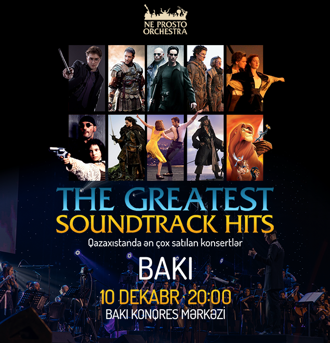 Əfsanəvi konsert “THE GREATEST SOUNDTRACK HITS” proqramına daxildir: The Matrix, Titanic, The Greatest Showman, La La Land, Agent 007, Mission Impossible, The Godfather, The Mask, Leon, Rocky, Gladiator, Interstellar, The Lion King, Dune, Inception, Pirates of the Caribbean, Madagascar, Harry Potter və Game of Thrones. Sizi nələr gözləyir: -Orkestrin canlı ifasında möhtəşəm musiqilər və kino tarixinin ən yaddaqalan səhnələrinin videoçarxları -20-dən çox musiqiçi və xorun iştirakı ilə böyük simfonik şou -Keçmişə aparan unudulmaz atmosfer -Bu kino şahəsərlərinə ilk baxışdakı emosiyaları yenidən yaşamaq imkanı