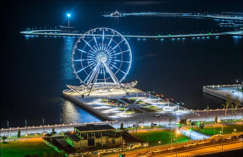 Xəzərin sahilində yerləşən bulvarda fənərlərin işıqları titrəyir, göydələnlərin əksi suda görünərək adi bir gəzintini kino kadrına çevirir.