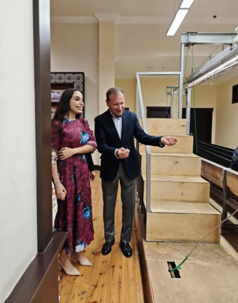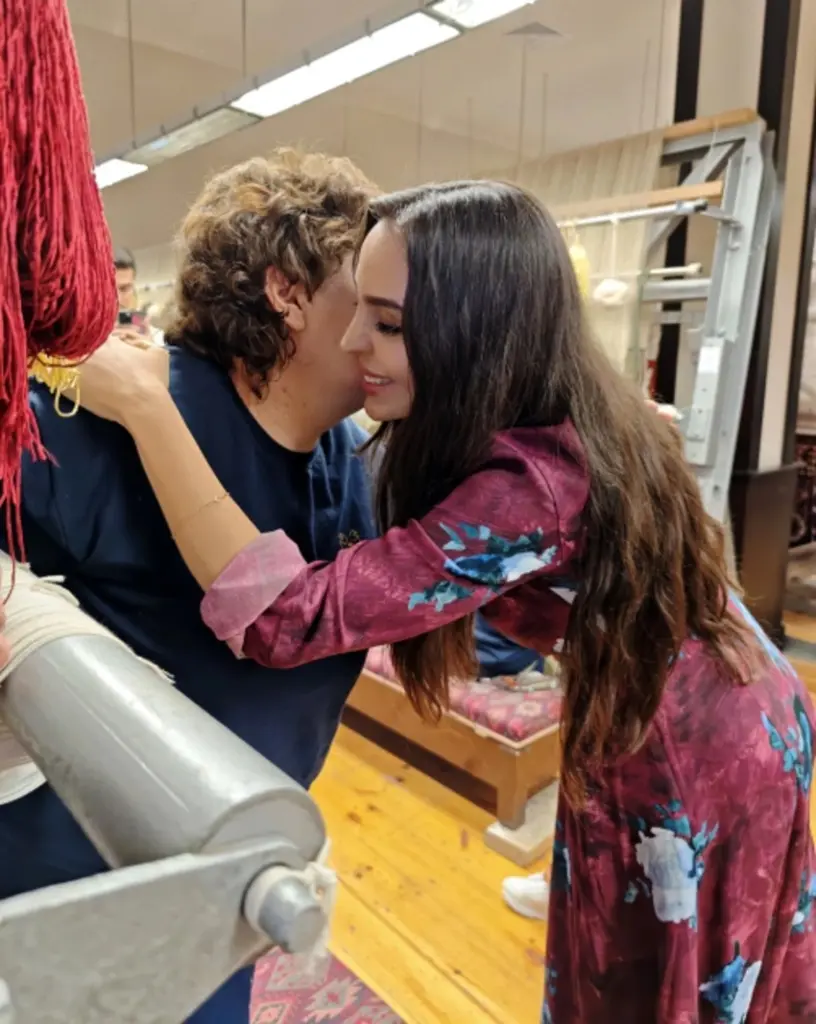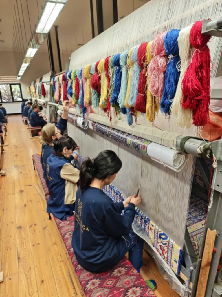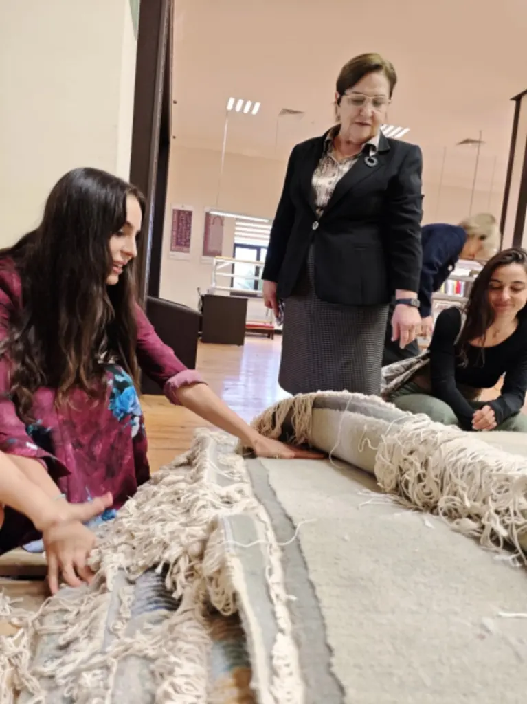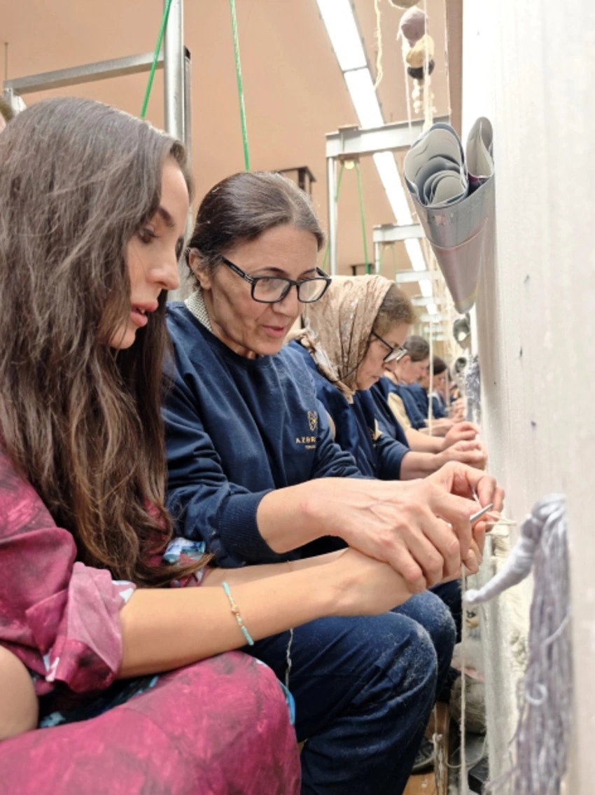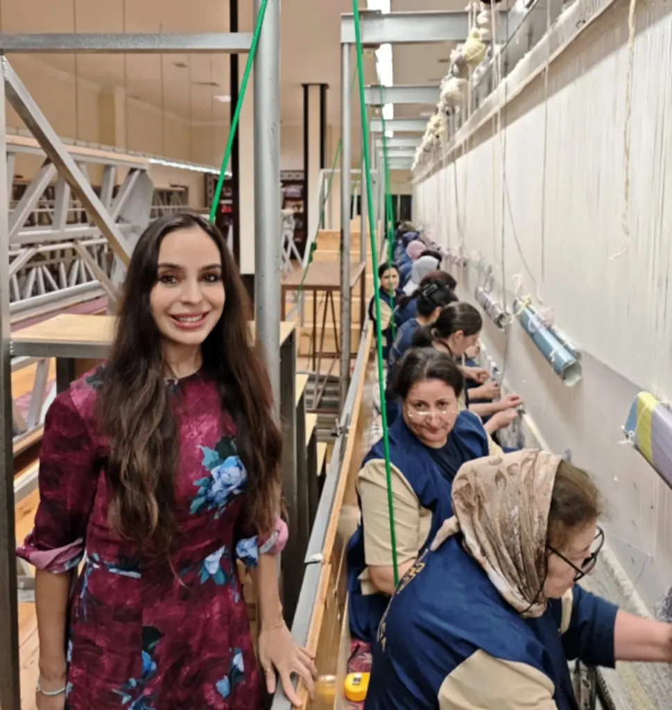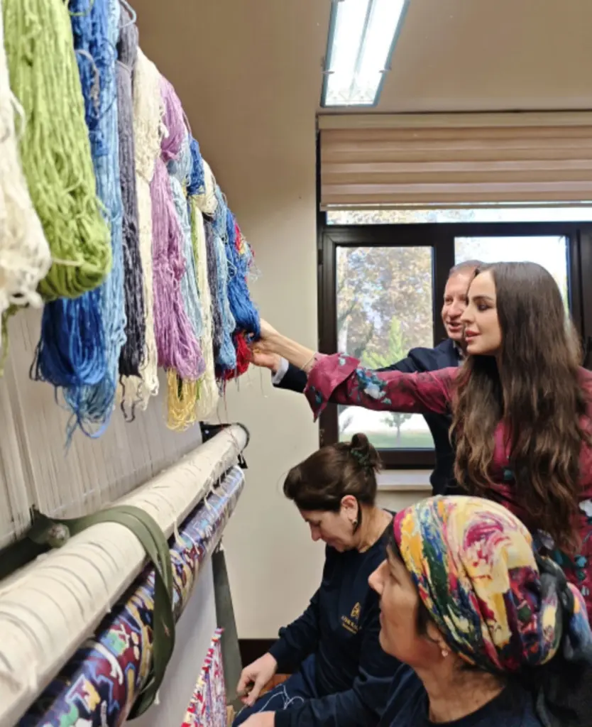 Leyla Əliyeva xalça ilə tanışlıqdan sonra toxucularla vaxt keçirib və xalçaya ilmə də atıb.