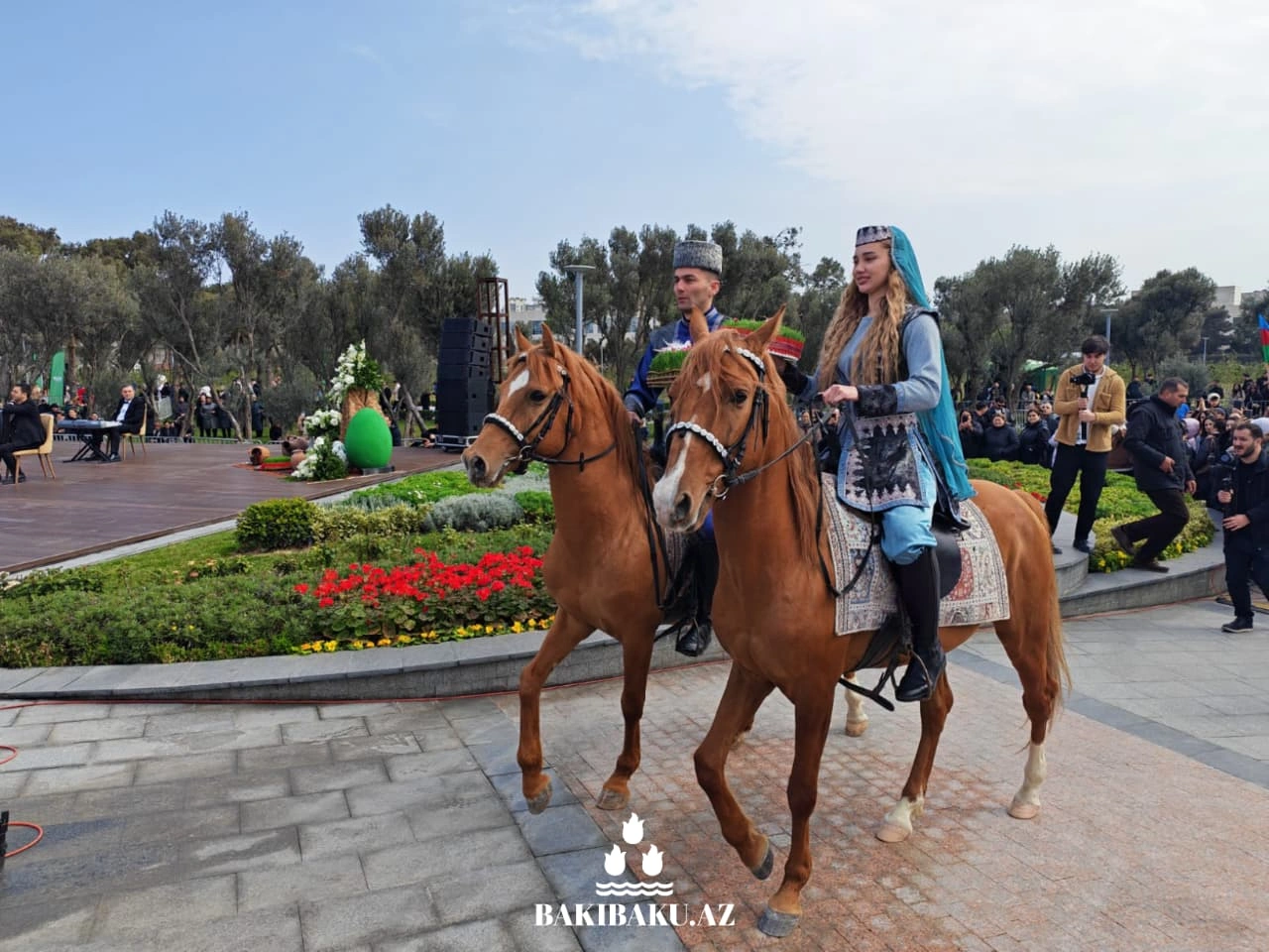 Yüksək bayram əhval-ruhiyyəsində təşkil edilən və xüsusi zövqlə bəzədilmiş parkda xalq tətbiqi sənət nümunələrinin təbliğ edildiyi çadırlar quraşdırılıb, gənc rəssamların rəsm əsərləri nümayiş etdirilib. Tədbirdə əllərində dövlət bayraqları olan milli geyimli atlılar, dəvələrin, ponilərin müşayəti ilə Kosa, Keçəl, Bahar qızı, nağaraçılar, jonqlyorlar, pəhləvanlar və çalğıçılar iştirak ediblər.