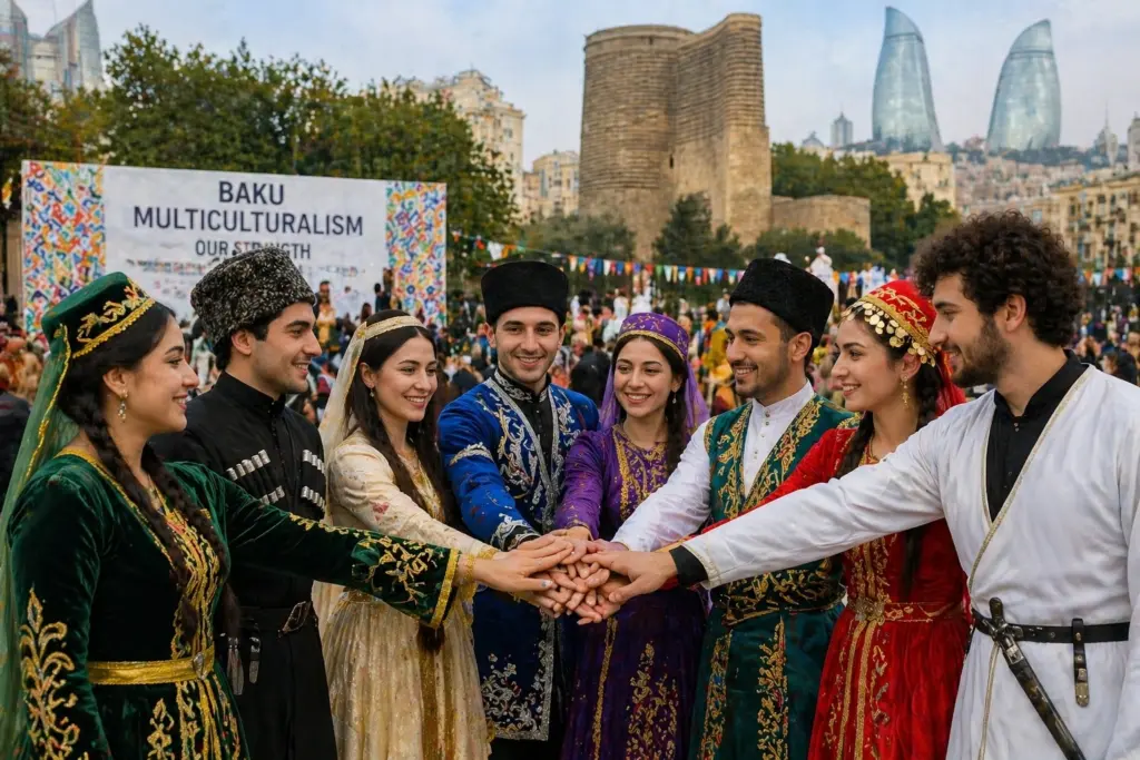 Баку всегда был мультикультурным городом. Русские, армяне (в историческом контексте), евреи, грузины, лезгины и другие народы жили здесь рядом. И сегодня в столице представители разных национальностей живут в атмосфере дружбы и взаимного уважения. Многочисленные фестивали, культурные мероприятия и международные проекты укрепляют эти связи. Уважение к разным культурам и совместное сосуществование — важная часть социальной структуры Баку.