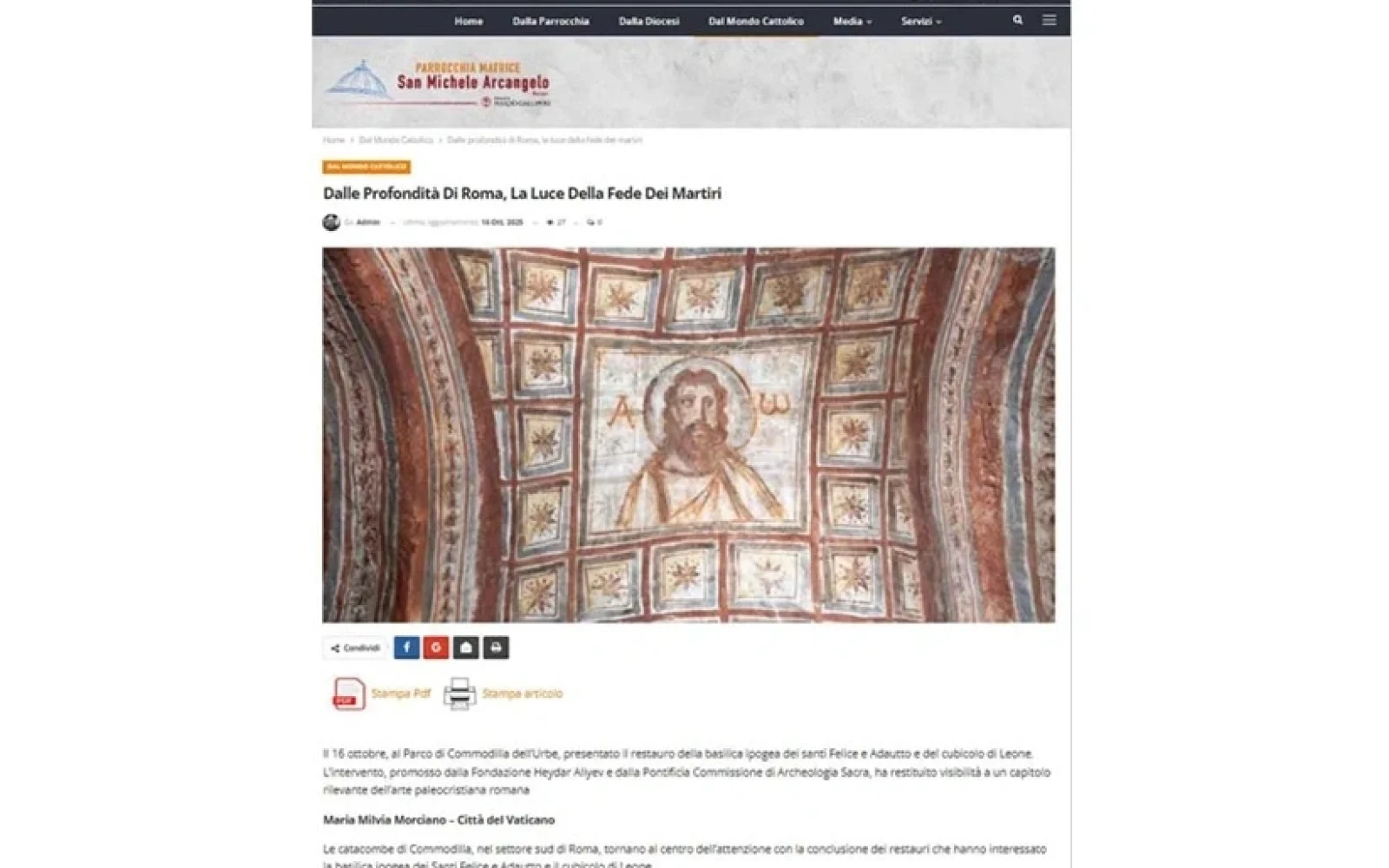 В материале, опубликованном порталом Vatican News Святого Престола, отмечается, что проект, реализованный при поддержке Фонда Гейдара Алиева, позволил вновь увидеть в катакомбах первые артефакты раннехристианского периода Рима. Доводится до внимания, что местонахождение катакомб было обнаружено в XVIII веке, первые исследования начались в 1900 году. Катакомбы, где находятся первые артефакты раннехристианского периода, также известны тем, что там похоронены христианские мученики Феликс и Адавкт, и в средние века являлись местом паломничества верующих. Фрески в катакомбах, изображающие христианского первомученика Сан-Стефано, Иисуса, вручающего ключи от Рая апостолу Петру, и на другие темы, имеют исключительное религиозное и историческое значение.