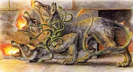 Цербер — огромный пёс с тремя головами, охранявший врата подземного царства Аида. Он не позволял душам мёртвых возвращаться в мир живых. Его спина была покрыта извивающимися змеями, а хвост оканчивался драконьей головой.