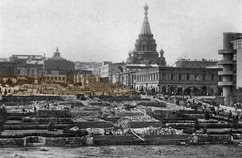 Подготовка началась в 1931–1932 годах. Территория была плотно застроена старинными, но ветхими домами конца XIX века, и их снос стал первым этапом большого преобразования. Подобные же работы параллельно проводились на месте будущего памятника поэту Низами Гянджеви — эпоха требовала пространства, воздуха, монументальности.